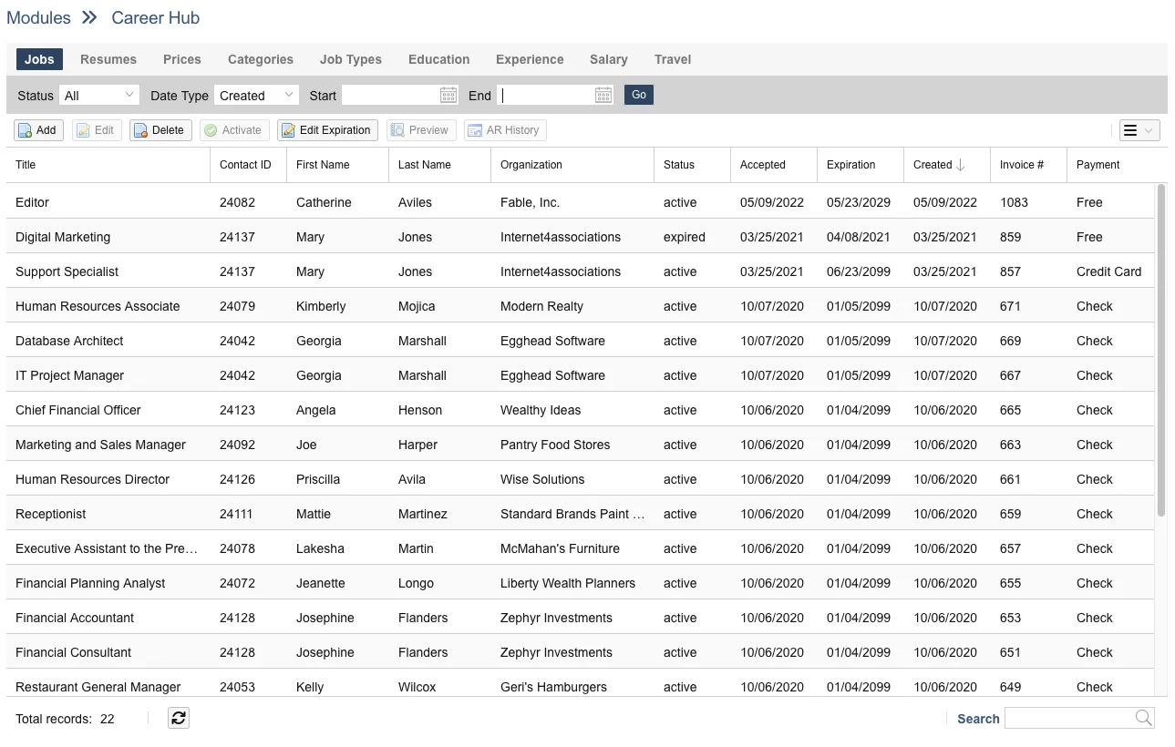 Control posting approval workflows, set pricing for different posting durations (30, 60, 90 days) by member type, configure featured upgrade options for premium placement, track job board revenue in real-time with separate GL accounts, and manage refunds or expiration date extensions from the admin panel—all without manual invoicing or chasing payments.